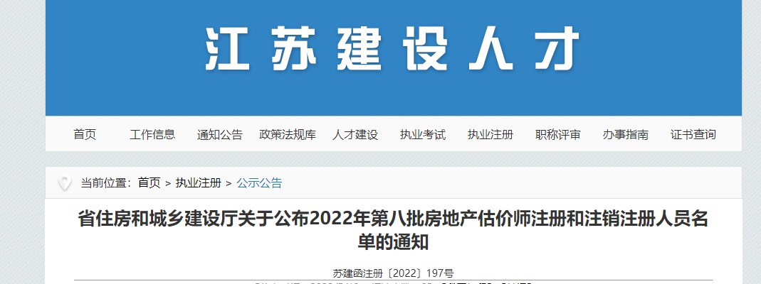 江蘇省關(guān)于公布2022年第八批房地產(chǎn)估價(jià)師注冊和注銷(xiāo)注冊人員名單公告