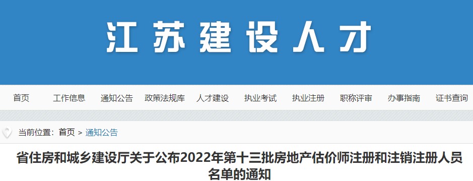 江蘇關(guān)于公布2022年第十三批房地產(chǎn)估價(jià)師注冊和注銷(xiāo)注冊人員名單通知
