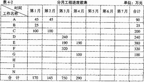 4.若該工程的各項工作均按最早開(kāi)始時(shí)間安排,各工作均按勻速完成,且各工作實(shí)際工程量與估計工程量無(wú)差異,在表4-2中填入H、I、N三項工作分月工程進(jìn)度款。