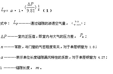 系統開(kāi)始運轉后,由于新風(fēng)Lw的吸入,室內空氣壓力增加,當增加的△P足以通過(guò)窗縫、門(mén)縫滲透到室外的空氣量Lp=Lw時(shí),系統的運轉達到了空氣的平衡,此時(shí)的△P為室內的正壓值,一般設計采用△P=5~10Pa,按作用壓差法室內的滲透空氣量可用下式計算