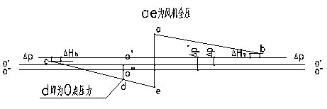 O為大氣壓力線(xiàn),△P~△P為室內正壓線(xiàn),ab為送風(fēng)管的壓力降, △Hs為送風(fēng)口的壓降,△Hh為回風(fēng)口的壓降。Cd 為回風(fēng)管壓降,de為空調箱壓降。 d點(diǎn)處于負壓狀態(tài),由于負壓值O‘d的存在,大氣被吸入混合箱內。