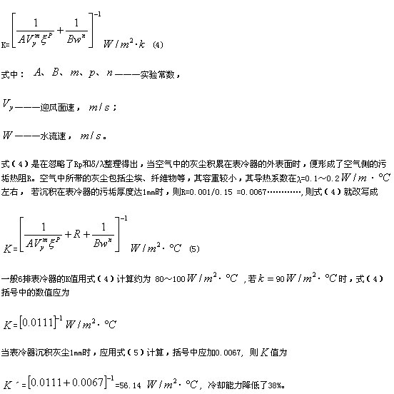 若對冷卻塔的循環(huán)水不進(jìn)行處理,則水側污垢熱阻最小值(不計水中鈣鎂離子濃縮后的沉淀)也要達到Rf =0.0005m2·k/w, 將式中的Rf=0.00018改成Rf=0.0005,其他數值不變,則其計算結果為k=3180.0005m2·k/w,傳熱能力下降了46% .