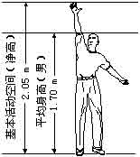 1.2 人民對生活空間的基本要求房屋是人民生產(chǎn)和生活的基本空間,房屋和房間的設計應該滿(mǎn)足人民生產(chǎn)和生活的最起碼的活動(dòng)需求。人的基本活動(dòng)空間與房屋層高之間的空間關(guān)系,根據有關(guān)資料綜合統計分析,可以形象地表示,如圖1所示。
