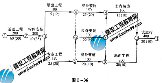 9、【背景】某單項工程按如圖1-36進(jìn)度計劃正在進(jìn)行施工。圖中箭線(xiàn)上方數字為工作縮短1天需增加的費用(元/天),箭線(xiàn)下括弧外數字為工作正常施工時(shí)間,箭線(xiàn)下括弧內數字為工作最快施工時(shí)間。原計劃工期是220天,在第110天檢查時(shí),工作2-3(構件安裝)已全部完成,工作3-5(專(zhuān)業(yè)工程)剛剛開(kāi)始施工,3-4按計劃進(jìn)行。由于3-5是關(guān)鍵工作,所以它拖后10天,將導致工期延長(cháng)10天完成。