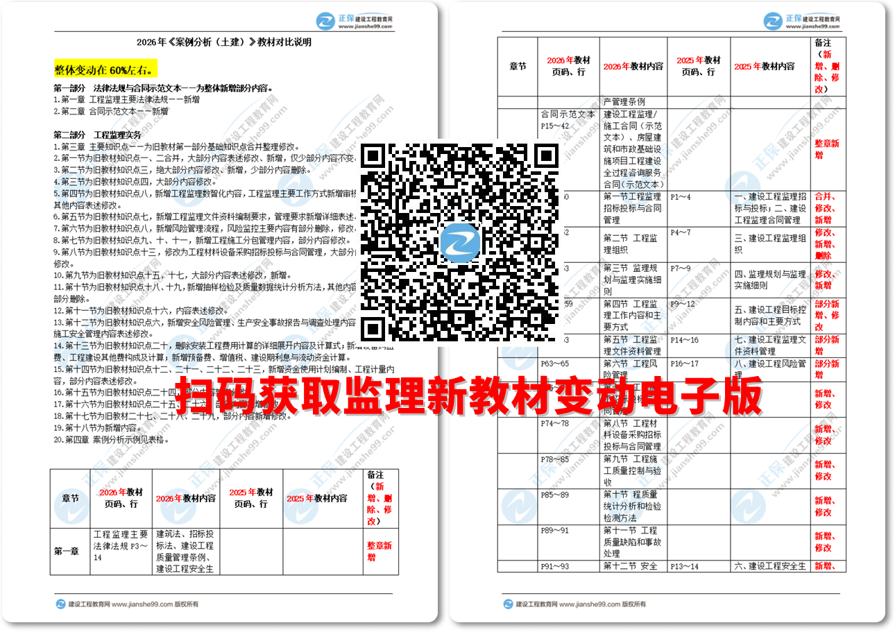 2026年監(jiān)理工程師考試官方教材正式發(fā)布,建設工程教育網(wǎng)老師為大家梳理2026年《土建案例》教材變動詳細內容。具體如下:
