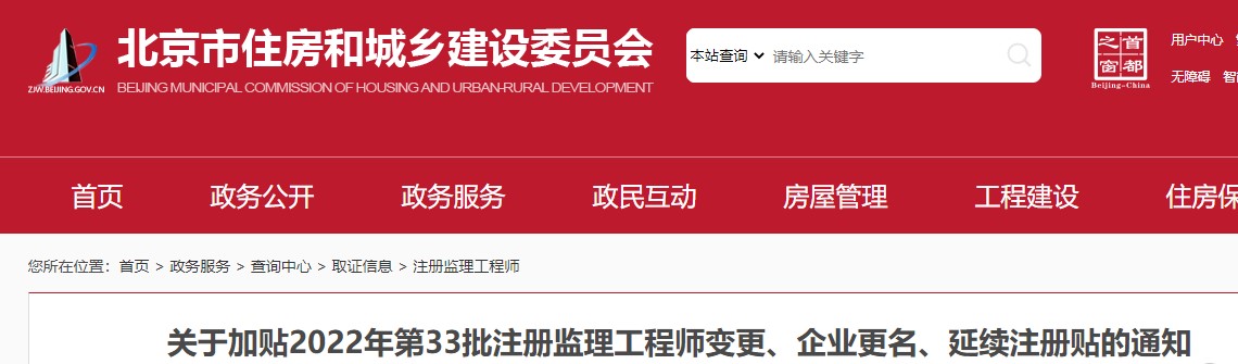 北京市關(guān)于加貼2022年第33批注冊監理工程師變更、延續注冊貼的通知
