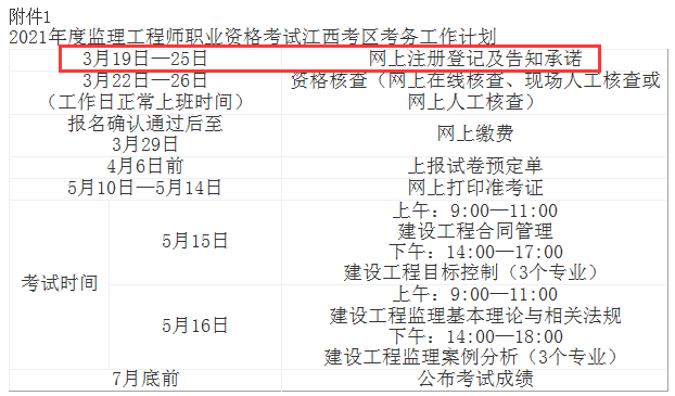 江西發(fā)布關(guān)于做好2021年度監理工程師職業(yè)資格考試江西考區考務(wù)工作的通知,其中公布了江西監理工程師報名時(shí)間為3月19-25日,具體內容如下: