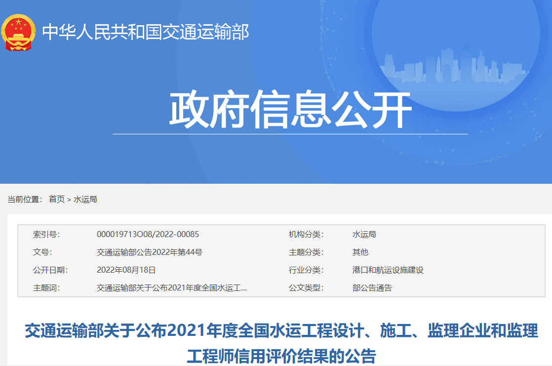 交通運輸部關(guān)于公布2021年度全國水運工程設計、施工、監理企業(yè)和監理工程師信用評價(jià)結果的公告