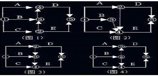 1. 某雙代號網(wǎng)絡(luò )圖有A、B、C、D、E五項工作,其中A、B完成后D開(kāi)始,B、C完成后E開(kāi)始。能夠正確表達上述邏輯關(guān)系的圖形是(?。?。
