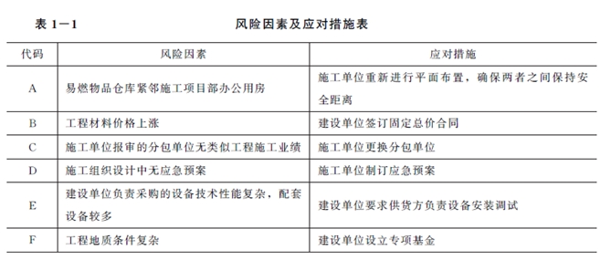事件3:針對該工程的風(fēng)險因素,項目監理機構綜合考慮風(fēng)險回避、風(fēng)險轉移、損失控制、風(fēng)險自留四種對策,提出了相應的應對措施,見(jiàn)表1-1。