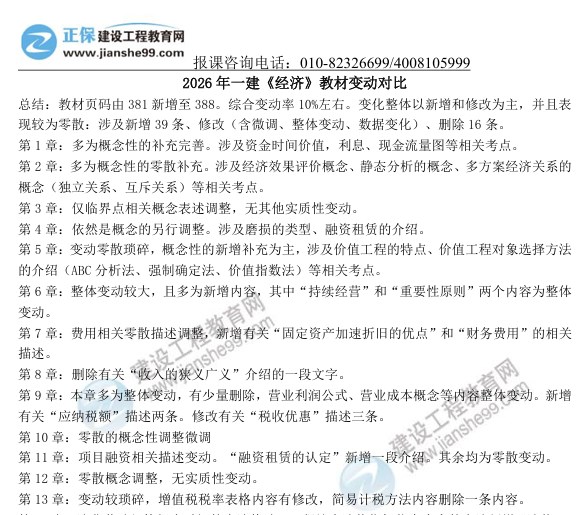 2026年一級建造師《工程經(jīng)濟》新教材變動對比來嘍!建設(shè)工程教育網(wǎng)教務(wù)團隊拿到教材后第一時間為大家梳理變動詳細內(nèi)容,經(jīng)核對,2026年工程經(jīng)濟科目整體變動約10%,教材變動內(nèi)容如下。達江老師為大家?guī)砹私滩淖儎咏馕鲋辈?,可以點擊下方圖片進入直播回放入口查看