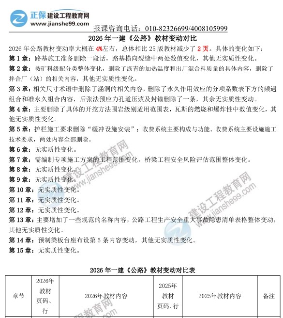 2026年一級(jí)建造師《公路工程》新教材變動(dòng)對(duì)比來嘍!建設(shè)工程教育網(wǎng)教務(wù)團(tuán)隊(duì)拿到教材后第一時(shí)間為大家梳理變動(dòng)詳細(xì)內(nèi)容,經(jīng)核對(duì),2026年公路工程科目整體變動(dòng)約4%,教材變動(dòng)內(nèi)容如下,更多變動(dòng)解讀請(qǐng)關(guān)注1月7日20:00聶旺老師直播間!直播入口>>
