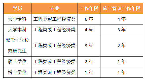 1、 取得工程類(lèi)或工程經(jīng)濟類(lèi)大學(xué)專(zhuān)科學(xué)歷,工作滿(mǎn)6年,其中從事建設工程項目施工管理工作滿(mǎn)4年。