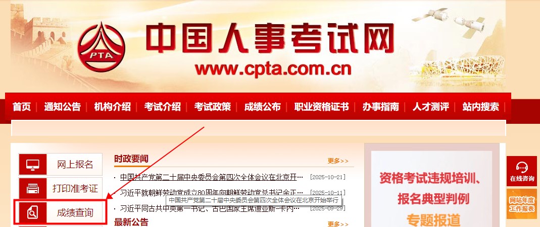 2025年一級建造師成績(jì)查詢(xún)入口:中國人事考試網(wǎng)-點(diǎn)擊左側“成績(jì)查詢(xún)”按鈕,輸入用戶(hù)名、密碼、驗證碼登錄即可查詢(xún)一級建造師考試成績(jì)。