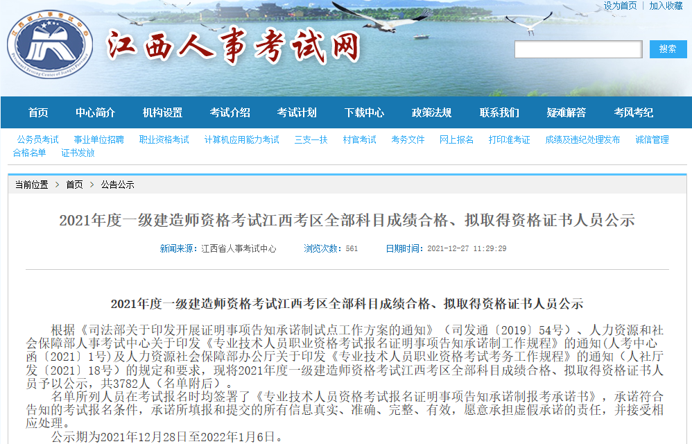 江西人事考試網(wǎng)發(fā)布《2021年度一級建造師資格考試江西考區全部科目成績(jì)合格、擬取得資格證書(shū)人員公示》,公示期為2021年12月28日至2022年1月6日。詳情如下: