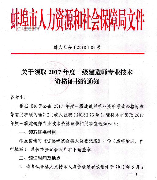 安徽蚌埠市2017年度一級建造師合格證書(shū)領(lǐng)取通知