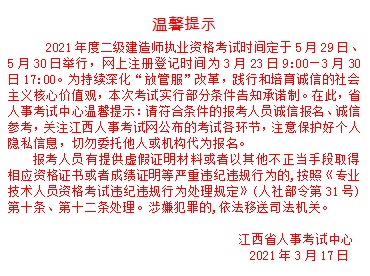 江西人事考試網(wǎng)發(fā)布2021年二級建造師考試報名溫馨提示,請江西二建考生仔細閱讀,做好報名準備。