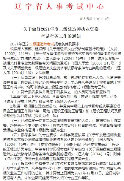 答:遼寧省2022年二級建造師考試報考條件還沒(méi)有公布,不過(guò)一般不會(huì )有大的變動(dòng),大家可以參考2021年的報考條件。