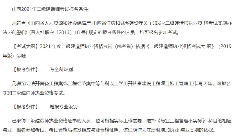 山西2022年二級建造師考試報考條件還沒(méi)有公布,不過(guò)一般不會(huì )有大的變動(dòng),大家可以參考2021年的報考條件。