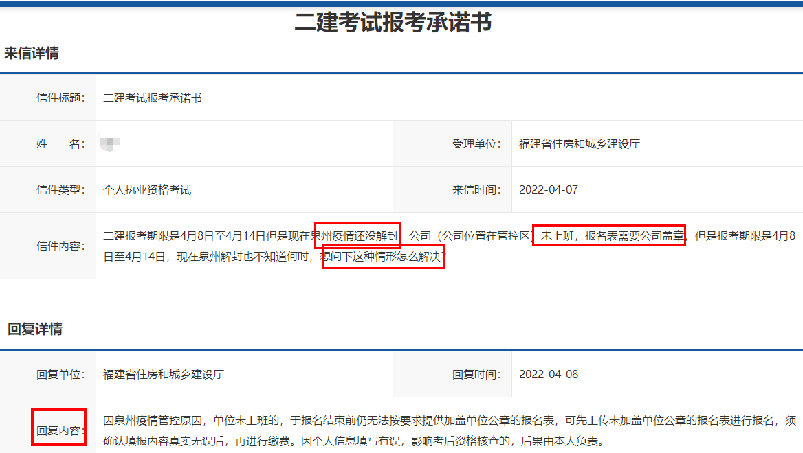 考生提問(wèn):二建報考期限是4月8日至4月14日但是現在泉州疫情還沒(méi)解封,公司(公司位置在管控區)未上班,報名表需要公司蓋章,但是報考期限是4月8日至4月14日,現在泉州解封也不知道何時(shí),想問(wèn)下這種情形怎么解決?