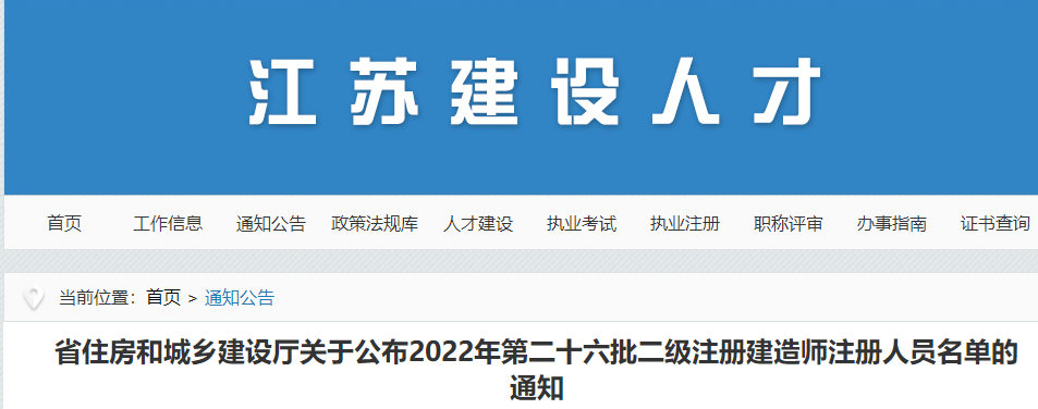 江蘇公布2022年第二十六批二級注冊建造師注冊人員名單的通知