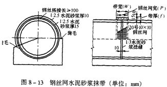 通常采用帶有混凝土條形基礎的鋼絲網(wǎng)水泥砂漿抹帶的剛性接口;在地質(zhì)條件較差時(shí)也應設置柔性接口。