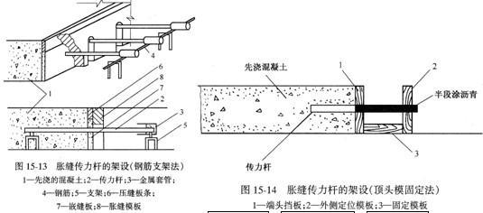 傳力桿的固定安裝方法有兩種。一種是端頭木模固定傳力桿安裝方法,宜用于混凝土板不連續澆筑時(shí)設置的脹縫。另一種是支架固定傳力桿安裝方法,宜用于混凝土板連續澆筑時(shí)設置的脹縫。兩種方法見(jiàn)圖示。