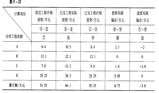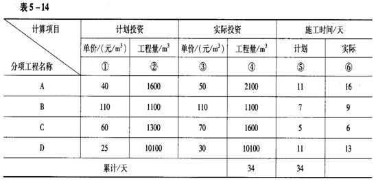 某分部工程由順序進(jìn)行的A.B.C.D四個(gè)分項工程組成,它們各自的計劃單價(jià)、計劃工程量和計劃所需的施工時(shí)間,以及施工實(shí)際所用的時(shí)間、費用和實(shí)際完成的工程量見(jiàn)表5-14.