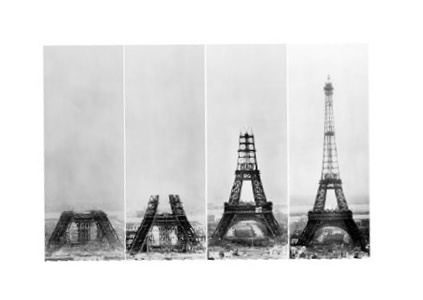 1886 年埃菲爾和下屬工程師科其林、諾古伊爾的設計從107個(gè)候選者中勝出。埃菲爾鐵塔1887 年1 月26 日動(dòng)工,1889 年3 月31 日告竣,用7200噸鍛鐵建造,總重量10100 噸……埃菲爾鐵塔采用交錯式結構,由四條與地面成75 度角的、粗大的、帶有混凝土水泥臺基的鐵柱支撐著(zhù)高聳入云的塔身,內設四部水力升降機(現為電梯)。
