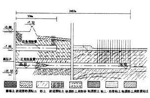 φ2000mm排海管道工程是嘉興市污水處理工程的一個(gè)重要組成部分。正常排放管總長(cháng)2060m,管道內徑2000mm,從高位井向大堤外頂進(jìn),埋深9.30~21.81m,出洞口管內底標高為-20.23m,前1747.5m為下坡(-2.5‰)頂進(jìn),最后302.5m為平坡頂進(jìn),終點(diǎn)管內底標高為-24.60m.頂進(jìn)施工采用F-B型鋼承口式鋼筋混凝土管、楔形橡膠圈接口、多層膠合板襯墊。