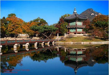 1392年李成桂建立朝鮮,定都今日的漢城,即朝鮮歷史上著(zhù)名的李朝,景福宮是當時(shí)的皇宮。四周建有宮墻,東西南北各開(kāi)宮門(mén),宮內呈前朝后寢,后設花園的布局。據《朝鮮通史》記載,1866年大院君專(zhuān)政,曾重修景福宮,歷時(shí)兩年,耗資二千五百萬(wàn)兩白銀。由此可推測景福宮全盛時(shí)期的規模和奢華程度。今天,宮內原有的二百多座建筑僅剩十余。主體建筑勤政殿,重檐歇山頂,是李朝皇帝坐朝議事和舉行大典的“金鑾殿”。勤政殿四周建有寬敞的圍廊,后面又有三個(gè)小殿,再往后是寢宮,現已不存。勤政殿西北方向有一方池,池中砌有三臺,最大的臺上建有兩層的慶會(huì )樓,另外兩個(gè)臺上栽植樹(shù)木。景福宮最后是御花園,園內有方形水池,建一亭名為“香遠”,入夏池內盛開(kāi)荷花,應取漢文化中“香遠益清”之意吧。和中國北京金碧輝煌的紫禁城相比,景福宮則顯得有些“平民化”,讓人感到樸實(shí)親切。