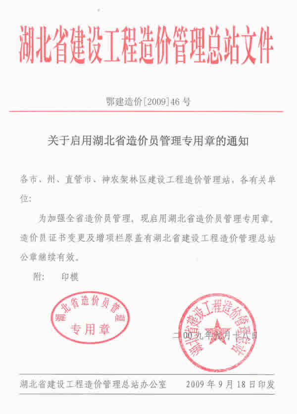 湖北省造價(jià)員管理專(zhuān)用章啟用的通知