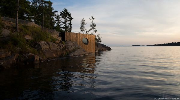坐落于多倫多北部的休倫湖碧綠的湖水彌補了其周?chē)f嚴的環(huán)境,為一處休閑場(chǎng)所提供了一個(gè)夢(mèng)幻般的地點(diǎn)。在這個(gè)感性的環(huán)境里,寧靜的風(fēng)光讓臨時(shí)住客不禁想起早已遠離人群的那份和諧。當PARTISANS的設計團隊成員與他們的新客戶(hù)來(lái)到現場(chǎng)、受托為這里設計建造一座桑拿房時(shí),他們就知道,最大的挑戰在于設計一個(gè)獨立的結構,不僅尊重周?chē)h(huán)境,還要在環(huán)境中日益完善。