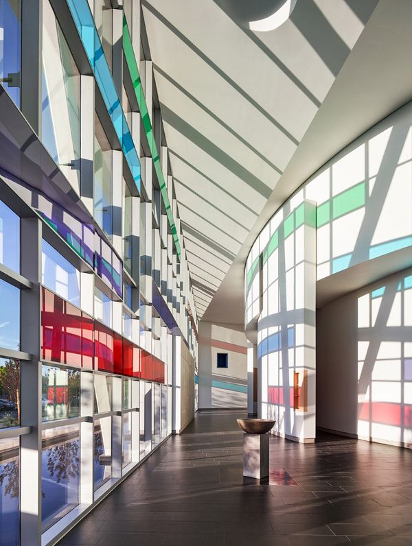 在建筑物的南部,如拼貼畫(huà)一般布置的透明、半透明和彩色玻璃讓路過(guò)的行人都能瞥見(jiàn)門(mén)廊的情況。這一面墻面對著(zhù)綜合體的其余部分,能展示出最多的室內構件。東西走向的墻體則覆蓋著(zhù)大塊的水泥板,用于固定折疊屋頂。在上方,一個(gè)細長(cháng)的塔式結構刺穿天棚,其上安裝了一個(gè)簡(jiǎn)單、自然的十字架,從校園和周邊地區都能看到這里。