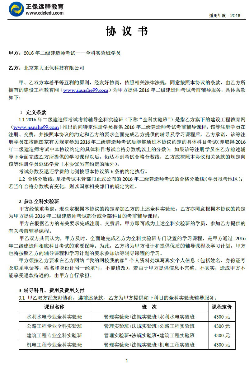 二級建造師“全科實(shí)驗班”協(xié)議書(shū)