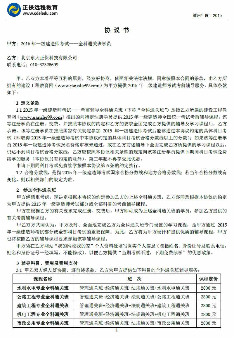 一級建造師“全科通關(guān)班”協(xié)議書(shū)