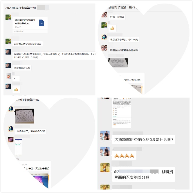 同學(xué)們每天早上起來(lái)就開(kāi)始看課,然后做相應練習題,再把當天的看課、做題記錄以及筆記和作業(yè)拍照發(fā)到群內的打卡小程序中分享。