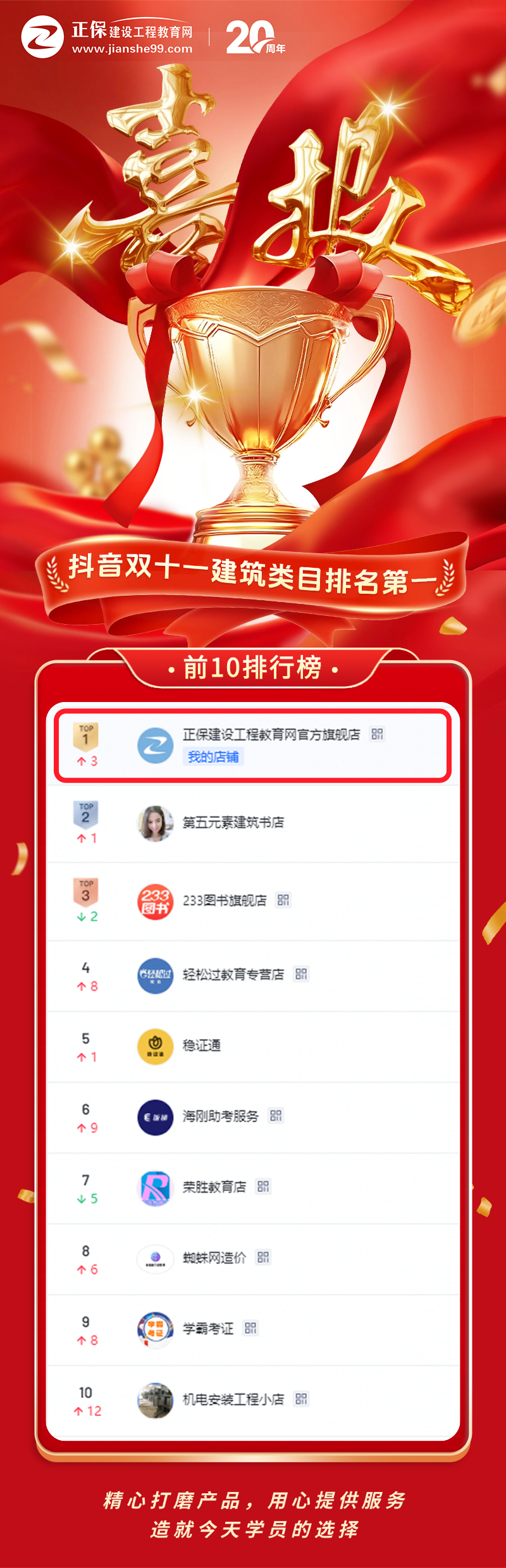 抖音官方榜單新鮮出爐!在剛剛過(guò)去的爽十一大戰中,正保建設工程教育網(wǎng)抖音旗艦店】以絕對優(yōu)勢登頂建筑類(lèi)目排行榜NO.1!這是繼“20周年”之后,我們送給全體建工學(xué)子與行業(yè)同仁的又一份硬核成績(jì)單!感謝各位同學(xué)用信任與認可,把網(wǎng)校托舉至抖音官方榜的巔峰。二十載春秋,我們始終懷揣初心,各位考生每一次下單、好評與通關(guān)拿證,都是照亮我們繼續前行的燈塔。未來(lái),我們將以更精品的課程、更貼心的服務(wù),陪伴更多建工人把“建筑夢(mèng)”照進(jìn)現實(shí),攜手再攀下一座行業(yè)高峰!