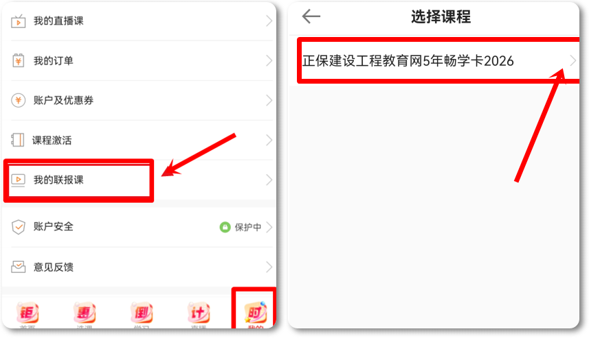 1.購課成功后,手機端安裝“正保職業(yè)教育APP”,登錄學員代碼后,點擊右下角“我的”按鈕;選擇“我的聯(lián)報課”。選擇課程“5年暢學卡”。進入開課(APP需8.5.0及以上版本方可使用。);