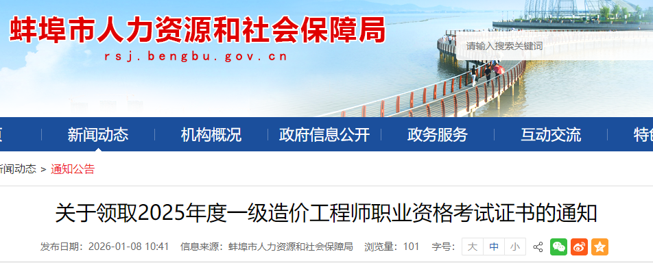 山東蚌埠市2025年度一級造價工程師考試合格證書領取通知