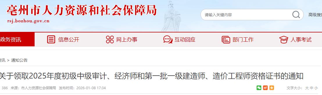 1、線上郵寄。2026年1月8日起長期有效,考生可線上申請,領(lǐng)取方式:瀏覽器搜索亳州市人力資源和社會保障局官網(wǎng),點擊“網(wǎng)上辦事”,在“專業(yè)技術(shù)人員資格證書管理服務”項目下按照要求申請證書郵寄服務。申請時務必寫清楚收件人地址,并在“備注”欄備注:擬領(lǐng)取的證書“序號”、證書名稱和證書考取年度,沒有按照要求填寫的考生將不予受理。