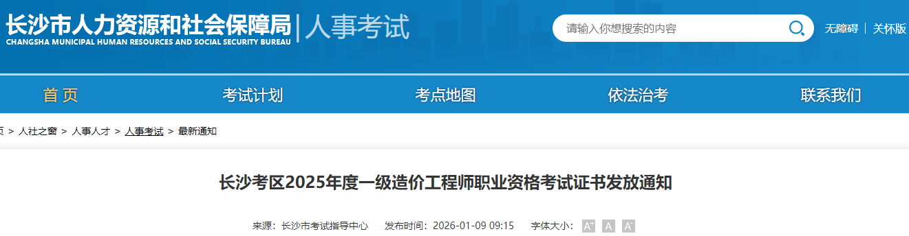 長沙考區(qū)2025年度一級造價工程師職業(yè)資格考試合格證書,將于2026年1月9日起開始發(fā)放?,F(xiàn)將有關事項通知如下: