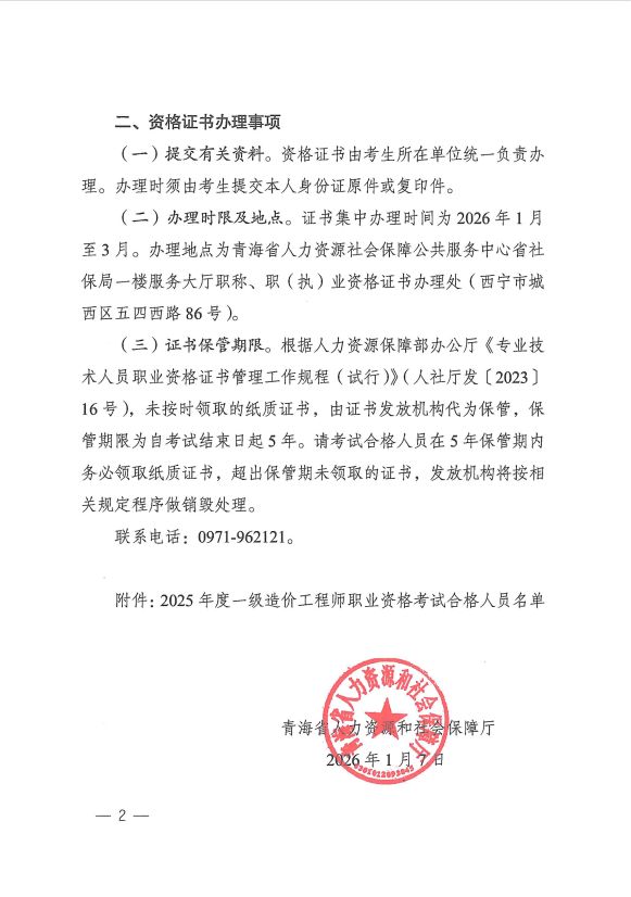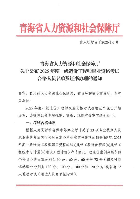 青海省人力資源和社會保障廳關(guān)于公布2025年度一級造價工程師職業(yè)資格考試合格人員名單及證書辦理的通知