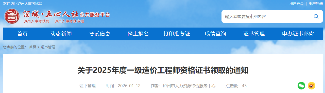 四川省瀘州市2025年度一級造價工程師資格證書領(lǐng)取通知