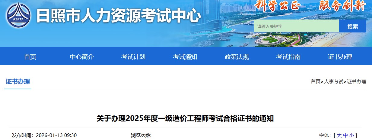 日照市2025年度未申請“證書直郵”考生的一級造價工程師考試合格證書已由省人力資源社會保障廳下發(fā)我市,現(xiàn)將有關(guān)事項通知如下: