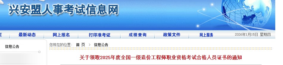 內(nèi)蒙古興安盟2025年度一級造價(jià)工程師資格證書領(lǐng)取通知
