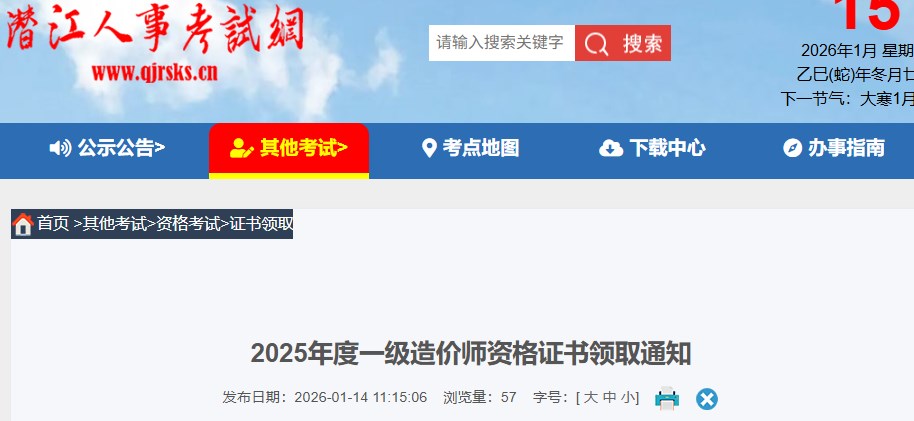 湖北省潛江市2025年度一級造價工程師資格證書領(lǐng)取通知