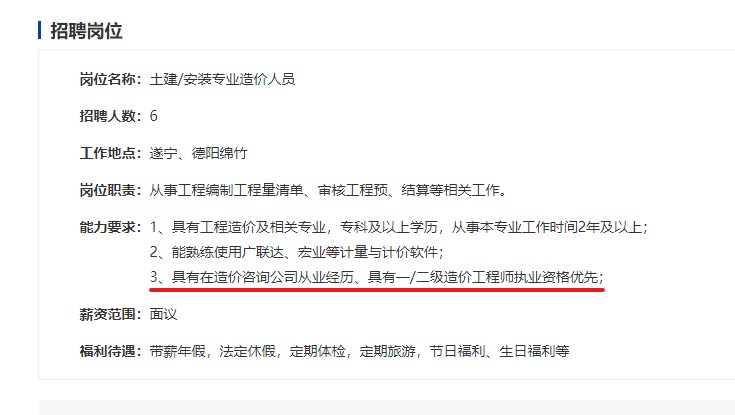 近日四川有兩家大型建設工程公司發(fā)布了招聘簡(jiǎn)章,分別招聘安裝、土建造價(jià)員,都要求有二造證書(shū)。
