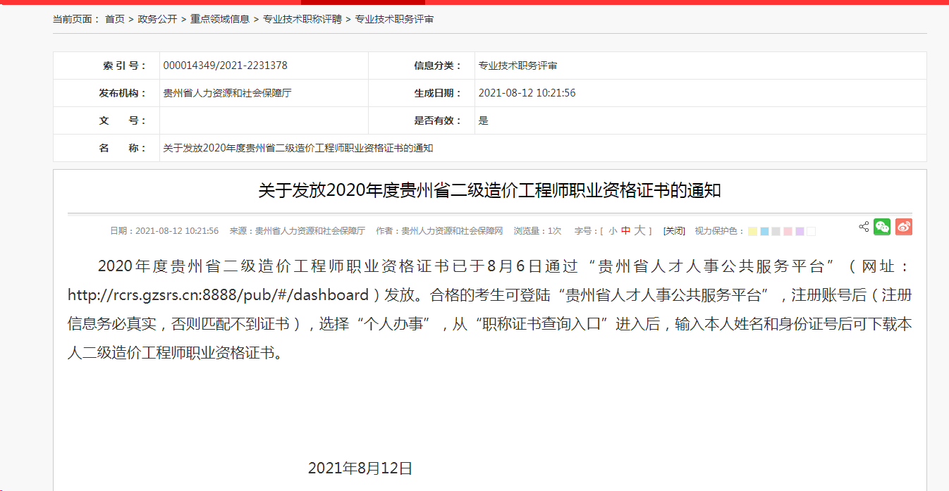關(guān)于發(fā)放2020年度貴州省二級造價(jià)工程師職業(yè)資格證書(shū)的通知