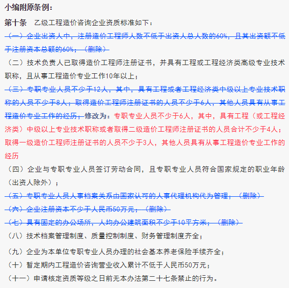 第十條第三項改為第二項,修改為:“專(zhuān)職專(zhuān)業(yè)人員不少于6人,其中,具有工程(或工程經(jīng)濟類(lèi))中級以上專(zhuān)業(yè)技術(shù)職稱(chēng)或者取得二級造價(jià)工程師注冊證書(shū)的人員合計不少于4人;取得一級造價(jià)工程師注冊證書(shū)的人員不少于3人,其他人員具有從事工程造價(jià)專(zhuān)業(yè)工作的經(jīng)歷”。